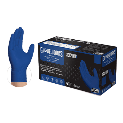 Gloveworks® Heavy Duty Royal Blue Nitrile gloves feature an aggressive raised diamond texture for a grip that won't slip, wet or dry. 6-mil thickness for strong barrier protection. Resistant to rips, punctures, and abrasions. Perfect for food-processing applications. Latex-free. 100 gloves per box, 10 boxes per case. 6-MIL