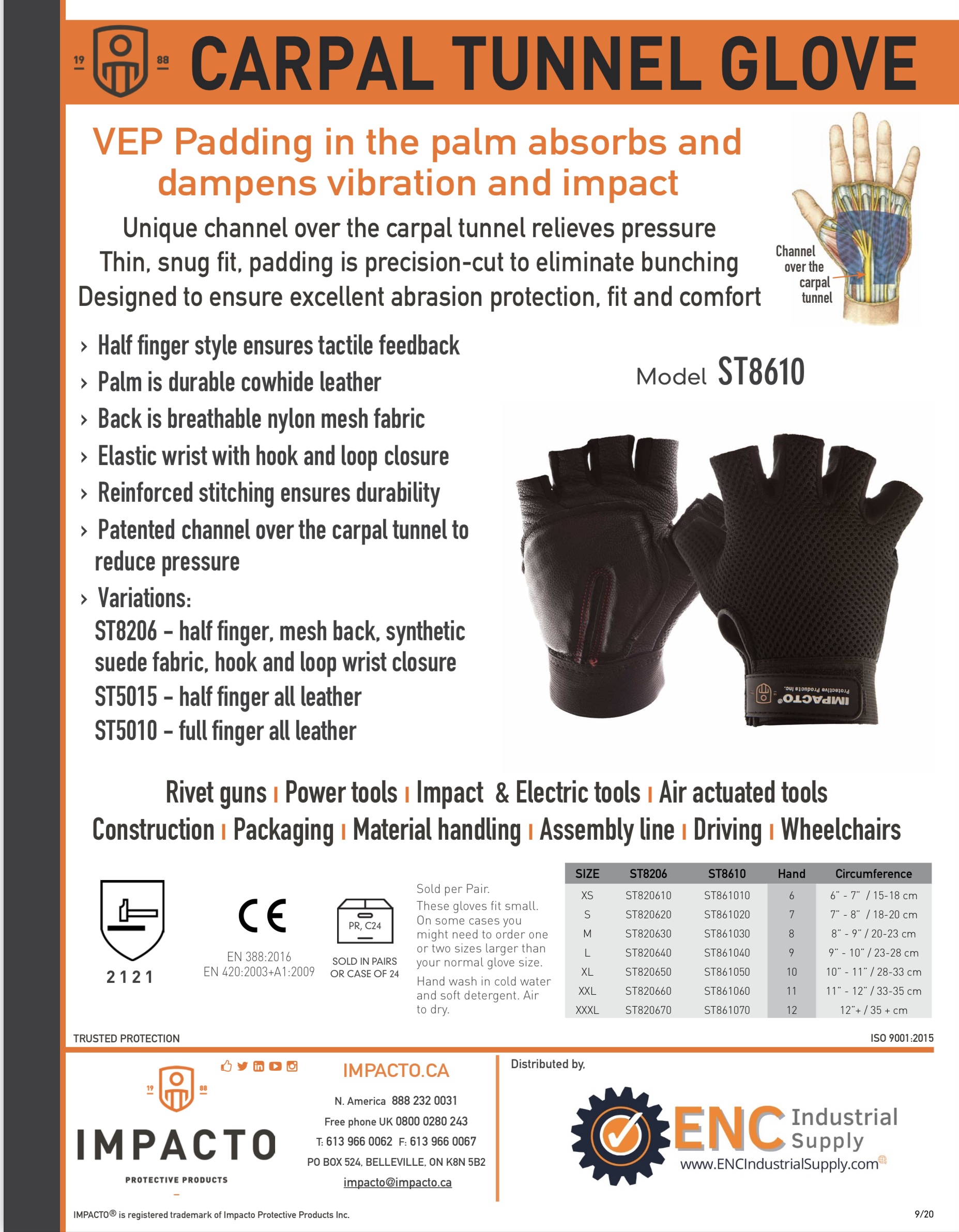 IMPACTO Carpal Tunnel Glove has unique channel over the carpal tunnel keeps pressure off the median nerve to alleviate symptoms of repetitive injuries such as Carpal Tunnel Syndrome caused by repetitive use and vibrating tools. Co-elastic polymer padding dissipates shock, Air mesh back for ventilation, Hook and loop wrist closure, Full Fingers & Durable black leather palm. *Synthetic Suede Fabric