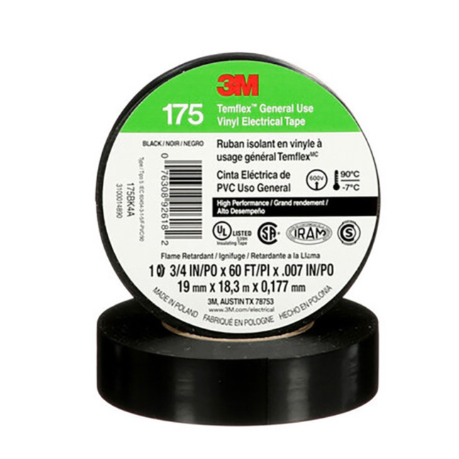 3M Temflex Vinyl Electrical Tape 175, Black, 3/4 in x 60 ft (19 mm x 18 m), 7 mil, 100 Rolls/Case *Priced per (10) Pack, Sold per Case