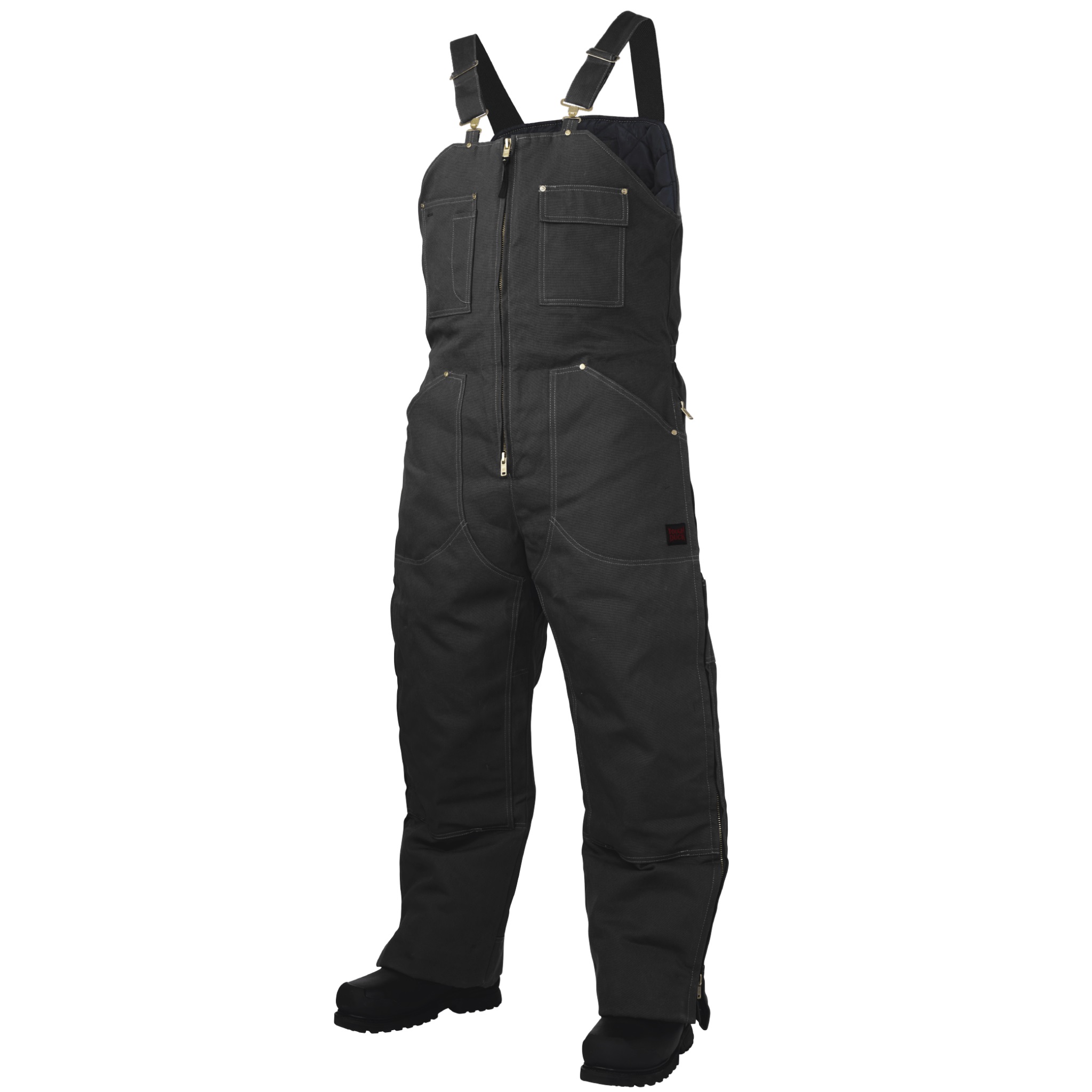 Shell: 100% Cotton 12 oz Premium Duck with durable water repellent finish Lining: Quilted 6 oz polyester insulation Features: Heavy duty two-way brass front zipper Adjustable shoulder straps Loss-proof chest pocket with flap and hook and loop closure Upper chest patch pocket with pencil pocket Ankle to hip heavy duty two way brass side leg zippers Two lower slash pockets Exclusive Full-chap double front leg Knee pad pockets Turned under hem allows for 3” tall leg extensions Two rear patch pockets Hammer loop and ruler pocket Back waist elastic Brass rivets and bartacks at stress points Triple stitched Waterproof knee and seat