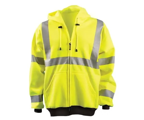 Meets ANSI/ISEA 107-2020 Class 3 - Type R 9 oz Polyester Fleece 2" Reflective Tape Elastic Waistband & Cuffs Full Zipper Closure Hoodie with drawstring & adjustable stoppers Temperature Rating: 6° - 51°F